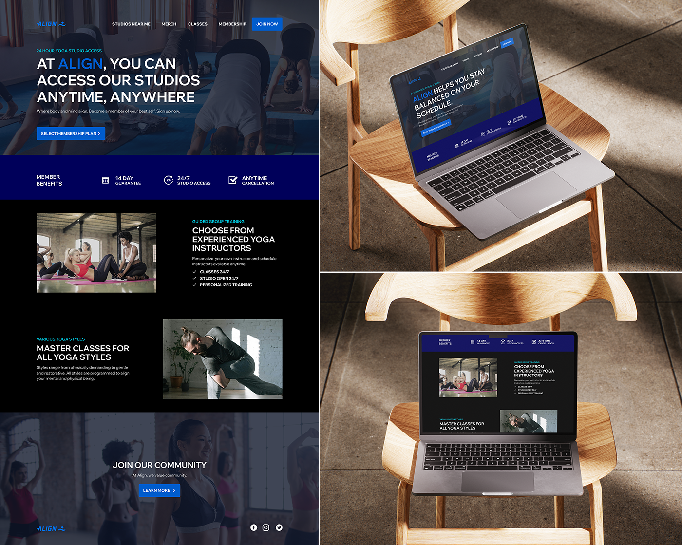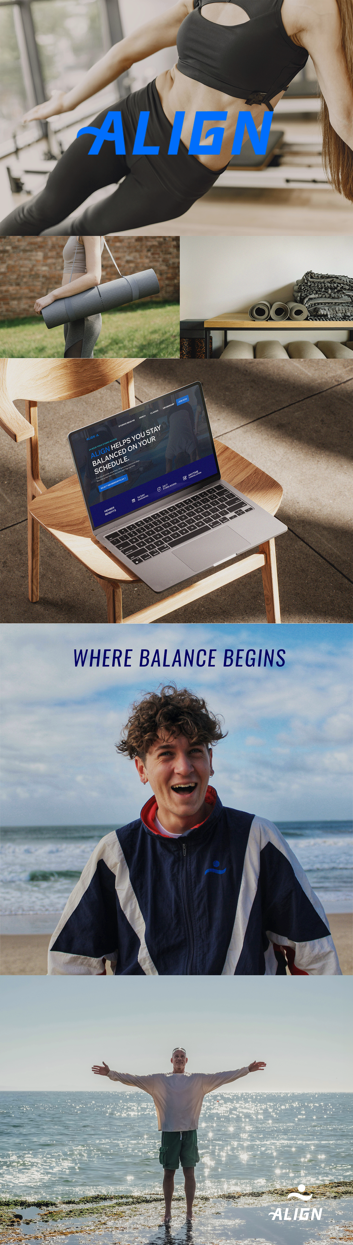 Align is a fictional yoga brand I conceptualized that focuses on efficiency, wellness, and accessibility. Centered on helping people align mentally and physically through mindful movement, the brand uses calm, uplifting visuals to communicate harmony and accessibility.